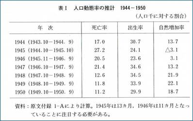 *脚注によれば、「GHQ. SCAP, ESS. Annual Changes in Population of Japan Proper 1 October1920-1October 1947,July 1948, p3」より引用。ここまで探し当ていることができなかったのでこれもご教示願いたい。